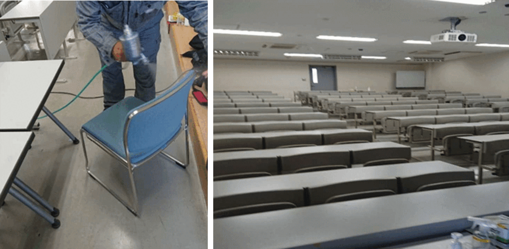 講義室では大阪教育大学同様、耐磨耗性を求められる部位を中心に塗布しましたが講義室という性質上、ドアハンドルやスイッチ類以外には座席と机が中心になります。座10席はファブリック素材のものが多いのですが繊維に強固に固着するグレードを用意しています。