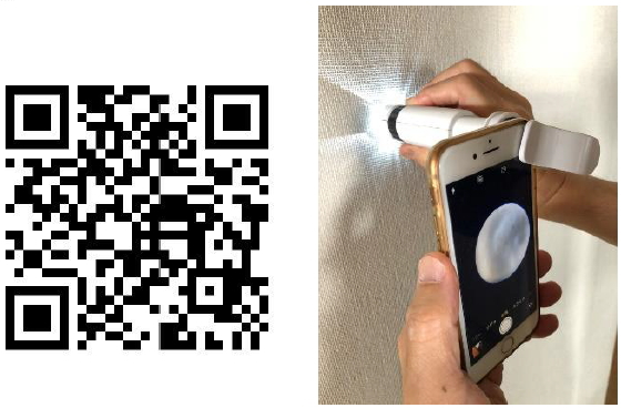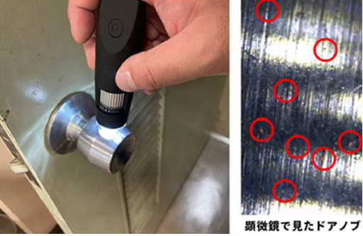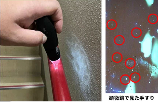 施工後は無色・透明のため一見するとわかりませんが、殺菌・抗ウィルスの薬効成分であるキラキラ光る銅粉は顕微鏡を使えば簡単に確認頂けます。当社ではスマホ顕微鏡を使用し、お客様に実際見ていただくことで完成検査を行っております。可視化している唯一の光コーティング剤です。