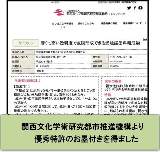 NASA が開発した燃料電池用フッ素樹脂Nafion を採用して鋭敏な可視光応答型光触媒+特殊な金属銅銀粉を組み合わせた独創技術による光触媒コーティング剤です。さまざまな機能を付加できたので従来のセルフクリーニング一辺倒だった光触媒に飽き足らないユーザーの高いご評価を得ています。