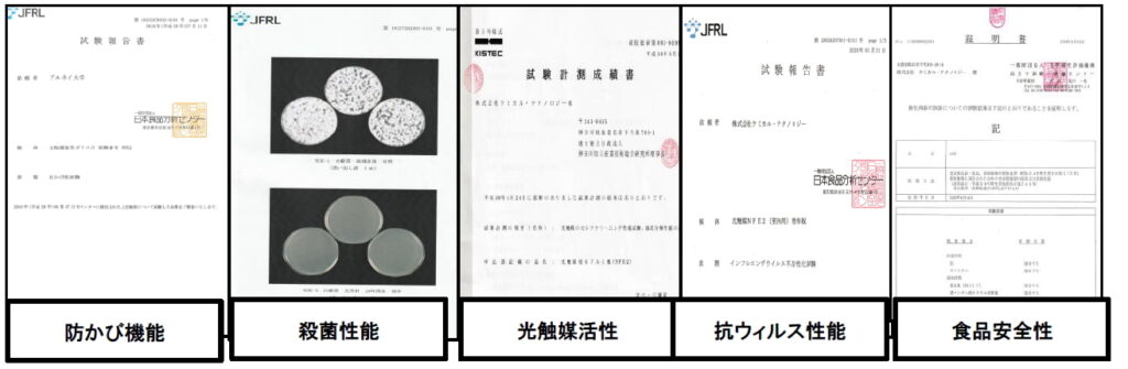 怪しげな光触媒製品が市場に跋扈しておりますがNFE2 はKISTEC、食品分析センター、高分子試験評価センター等の公的機関で性能試験を受け、ふんだんな証明書を交付されています。