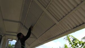 那覇市にて日差しの設置作業を行っております! 写真では、細かい部分の塗装作業中です!
