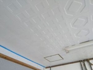 飲食店の退去後で原状回復してほしいとのこと。とにかく安くで仕上げてほしいとのことだったので、天井の一部張替及び使える部分は塗装しました。